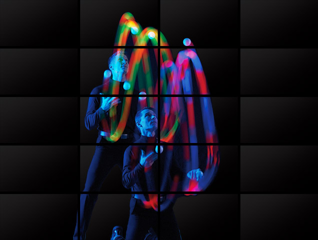 Mit 10 mikroprozessorgesteuerten Leuchtbällen jonglieren die beiden Artisten in kompletter Dunkelheit und bieten Ihnen und Ihren Gästen eine atemberaubende Illusion aus Farben und Musik.